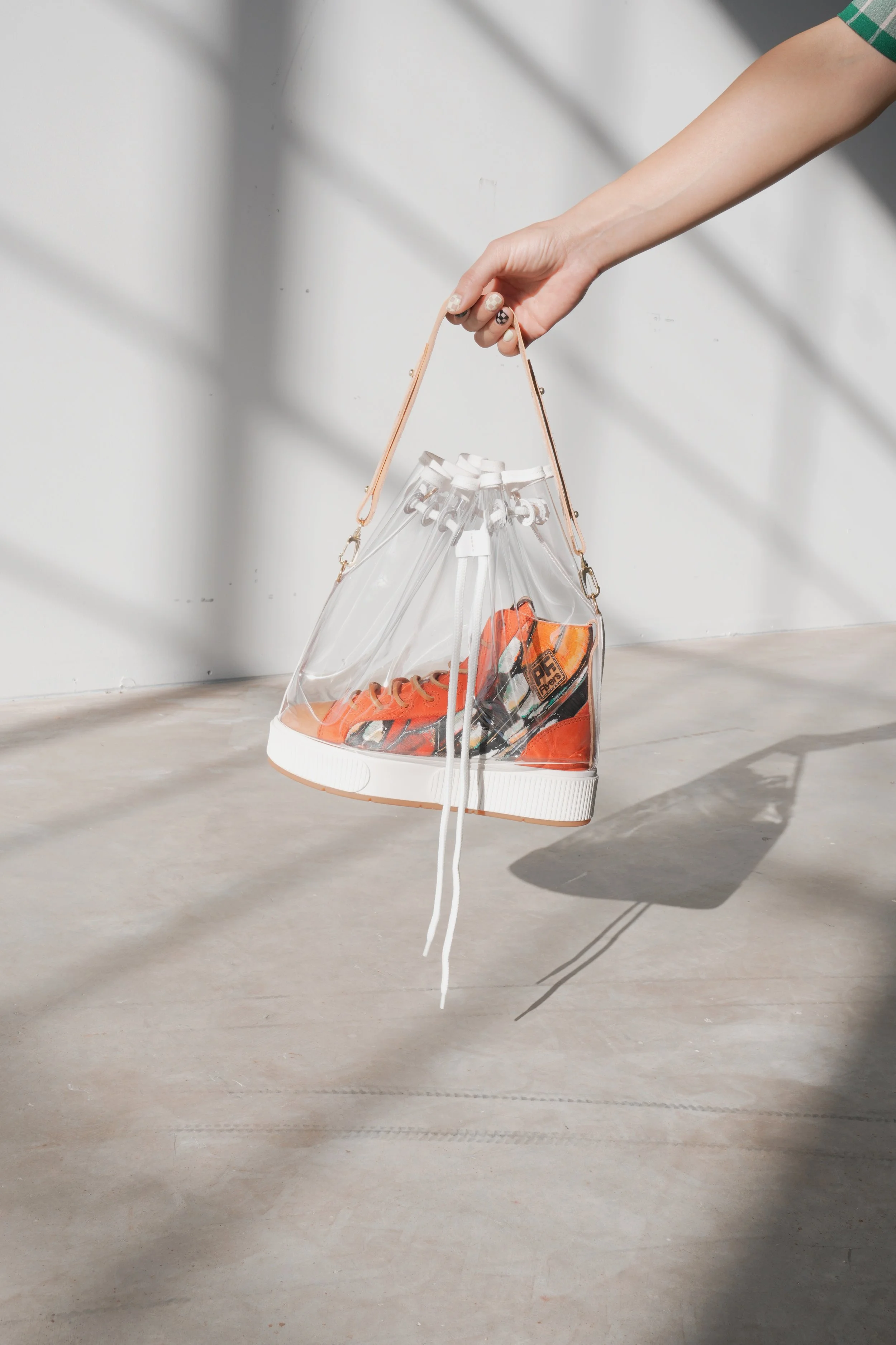 A person holds a transparent bag containing orange sneakers and a bottle against a plain background with shadows on the wall and floor.