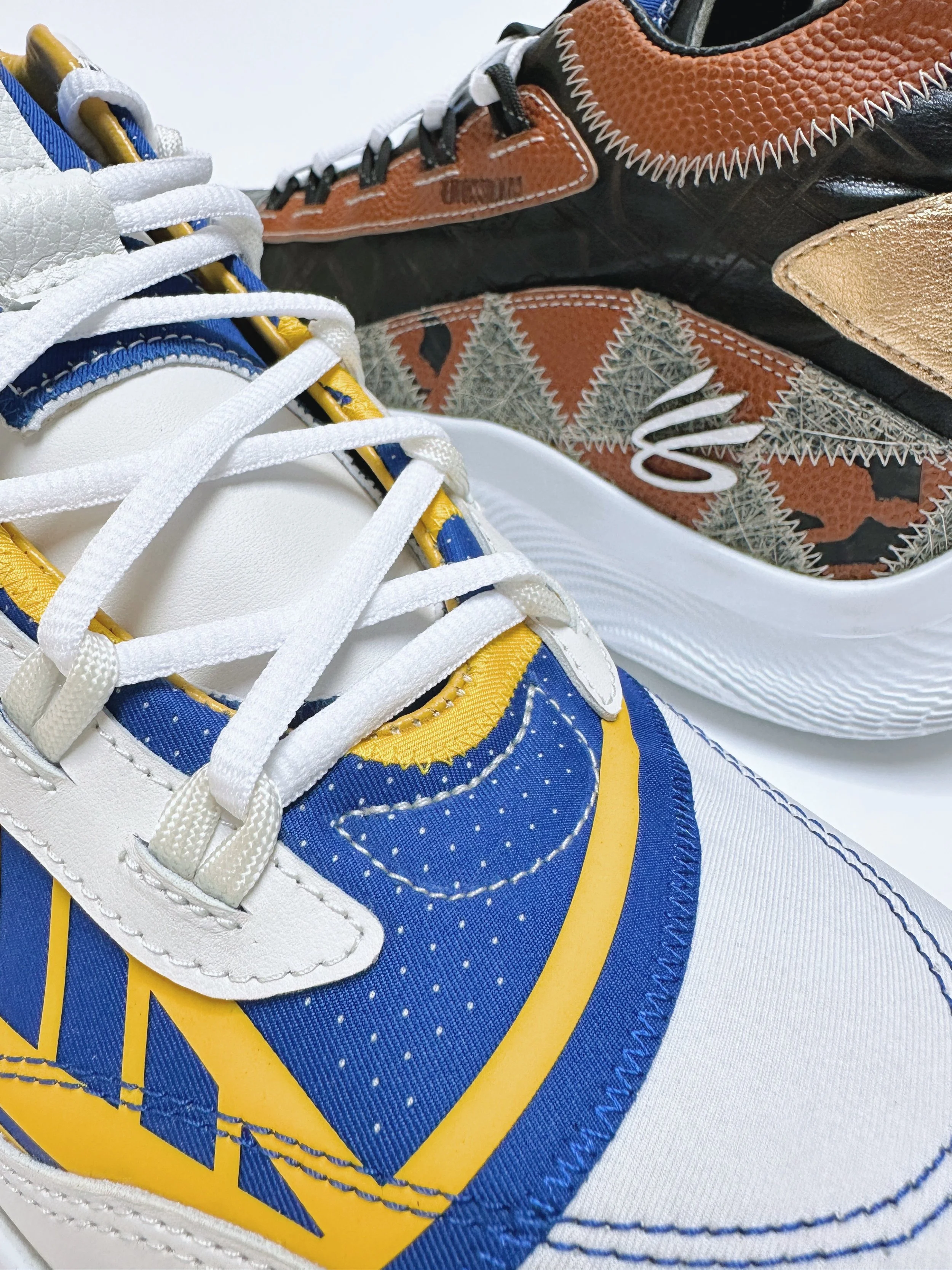 Close-up of two sneakers representing Stephen Curry and the Golden State Warriors with their championships, one with white, blue, and yellow design and the other with a brown, black, and gold design featuring stitching and textured panels.