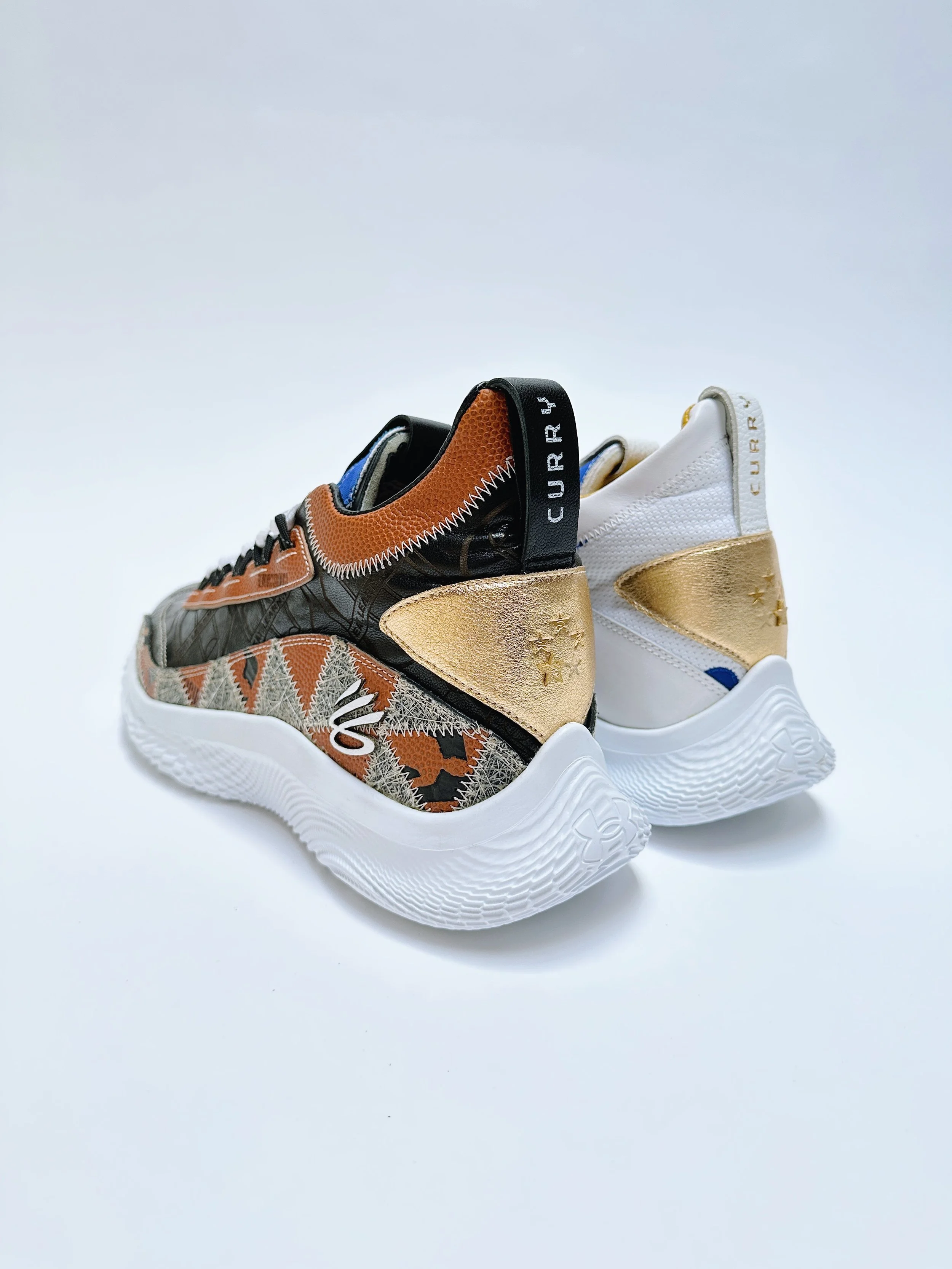 Pair of custom reconstructed Under Armour Curry 8 sneakers with multi-colored designs, gold accents, and chunky white soles.